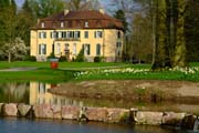 Gartenkunst im Queen-Auguste-Victoria-Park: Die Insel im Weiher und das Schloss im Spiegel des Wassers (Bild: Regionalia) |