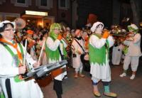 Auf dem Sammelplatz vor dem Narrenherrschaftssitz im Breisacher Rathaus hatten sich neben buntgefleckten Gauklern und immergrünen Zunfträten allerhand weißgewandete Untertanen versammelt, um zu den Klängen des Breisacher Narrenmarsches auf verschlungenen Pfaden zum Marktplatz zu wandeln. Am Gutgesellentor wurden die Umzugsteilnehmer musikalisch von den „Bajakl Schnäpfen“ in Empfang genommen. Mit neuer musikalischer Energie ging es dann bis auf den Marktplatz, wo auf den bereits für die Gauklertage errichteten Tribünen die Musiker/Innen der Stadtmusik, der „Schädelfätzer“ und der „Bajakl Schnäpfen“ sich selbst und den Umstehenden kräftig einheizten. Anschließend verlief sich der Umzug in ungeordneter Formation in den Breisacher Gaststätten, um, trotz der Schlafanzüge und Nachtmützen, dem Bett möglichst lange fern zu bleiben.