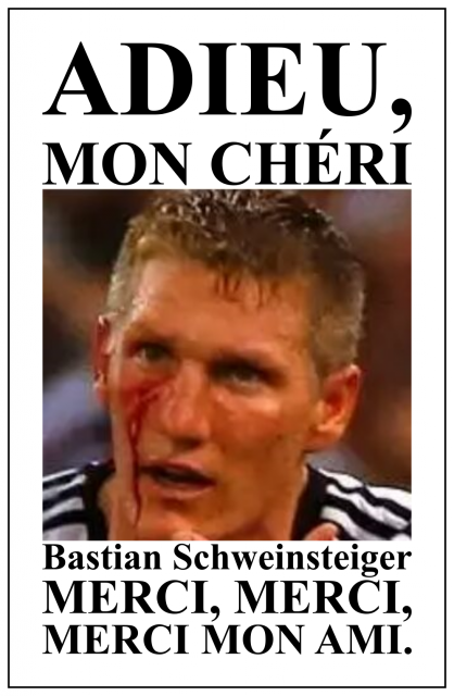 Mit Bastian Schweinsteiger hatten der deutsche Fußball und die deutsche Nationalmannschaft viel Schwein, Glück,  Erfolg und Freude.  DANKE Bastian, dass Du Dir für unsere Gaffer-Freude und unseren Trophäen-Ehrgeiz ("Wir sind Weltmeister") den Arsch aufgerissen hast und Dir Deine  Schultern, Knochen,  Bänder und Sehnen brechen liesst. Du wirst die Verletzungen für den Rest Deines Lebens bei schlechtem Wetter noch  bis zum Ende Deines Lebens schmerzhaft spüren.