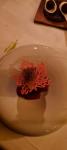 Die Cylindra-Bete aus dem elterlichen Anbau in Prestenberg war als Gel und auf Salz gebacken auf dem Teller präsent. Die Haselnuss erschien in vier Variationen: Als Panna Cotta, als piemontesische Nuss, als salziger Sponge und als gebackenes Bällchen mit Salzzitrone. „Opas Apfelmost“ (aus einer alte Streuobstwiese der Sorte Boskop) fand sich als Chutney und als Gel. Eine nur mit Butter gebundene Hummerbisque begleitete den in Nussbutter temperierten Hummer.