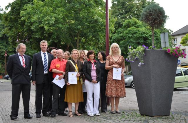 Am Freitag, den 23. Juli 2010, wurden die neuen Blumenkübel in der Breisacher Innenstadt offiziell ihren Gießpaten zugewiesen. Zur Übergabe der Patenschaftsurkunden durch Bürgermeister Oliver Rein war neben den Breisacher Geschäftleuten, die eine Kübelpatenschaft übernommen haben, auch der Leihgeber der imposanten Gefäße, der Baustoffhändler Thomas Birkenmeier, in den frühen Morgenstunden in die Neutorstraße gekommen.
