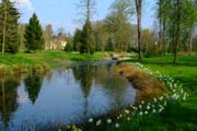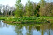 Gartenkunst im Queen-Auguste-Victoria-Park: Die Insel im Weiher und das Schloss im Spiegel des Wassers (Bild: Regionalia)