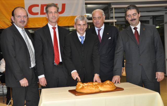 Feierlicher Anschnitt: Dr. Patrick Rapp (Mitte) verteilt die Neujahrsbrezel an Rudolf Lais, Dr. Klaus Schüle, Gundolf Fleischer und Bernhard Schätzle (v.l.n.r.)