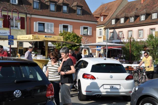 Dass der Marktplatz trotz Straßensperrung auf den ersten Blick aussieht wie immer, zugeparkt, erweist sich erst bei genauerem Hinsehen als Irrtum. Denn bei den zahlreichen glänzenden Fahrzeugen handelt es sich im Gegensatz zum Alltag ausschließlich um Neuwagen, die auf potentielle neue Besitzer warten. Wer sich den Kauf eines Neuwagens noch einmal überlegen möchte, kann dies bei einem Bier oder einem anderen Getränk an einem der zahlreichen Gastrostände tun. Wenn der Geldbeutel oder die ökologische Einstellung gegen den Kraftfahrzeugerwerb sprechen, besteht in der Fußgängerzone die Möglichkeit, sich mit einem politisch korrekten Fahrrad einzudecken. Für die Kleinen mit Mobilitätsdrang gibt es auf dem Neutorplatz ein Kinderkarussell. Und für alle, die entweder schon ein Fahrzeug haben oder keines wollen, bietet der Breisacher Einzelhandel sein gesamtes Sortiment vom Buch bis zum BH feil.