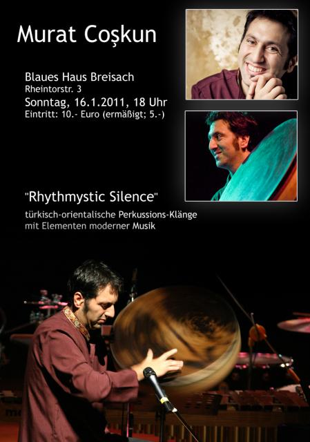 Das Solokonzert, mit dem Murat Coşkun am Sonntag, den 16. Januar 2011, um 18 Uhr ins „Blaue Haus“ kommt, trägt den Titel "Rhytmystic Silence". Caşkun wird mit seiner Musik die verschiedensten Perkussions- Instrumente aus der türkisch- orientalischen Tradition vorstellen und alle Zuhörer in seinen Bann schlagen und faszinieren.