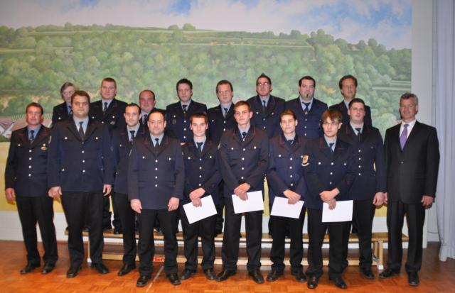 Beförderte Feuerwehrmänner mit Bürgermeister Oliver Rein und Kommandant Jochen Böhme