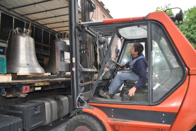 Präzision und gute Nerven: Staplerfahrer Norbert Rheinhold beim Glockenabladen