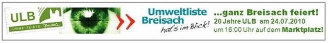 Zwar nur bis 22 Uhr aber nicht minder ausgelassen feiert die Umweltliste Breisach (ULB) am 24. Juli 2010 auf dem Marktplatz ihren 20sten Geburtstag. Die erst kurz vor den Gemeinderatswahlen 1989, unter anderem aufgerüttelt durch den GAU im ukrainischen AKW- Tschernobyl, gegründete ökologische Partei hatte auf Anhieb drei Sitze im Gemeinderat erobern können. Mittlerweile ist die ULB volljährig geworden und mit vier Sitzen im Rathaus aus dem politischen Leben der Stadt längst nicht mehr wegzudenken.