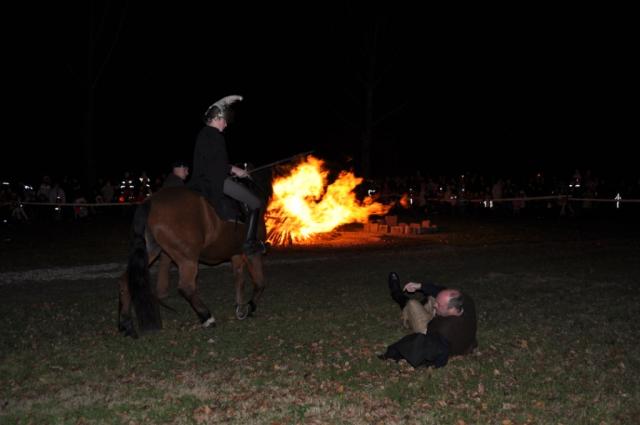 Umrahmt von den St. Martins- Hits „Laterne, Laterne“ und „Ich gehe mit meiner Laterne“ machte sich der Umzug , angeführt vom Heiligen Martin auf seinem Pferd, über Grüntor- und Jahnstraße auf den Weg zur Festwiese. Dort hatten die Mitglieder von THW und Freiwilliger Feuerwehr bereits das Martinsfeuer angefacht, das aufgrund des starken Windes beeindruckende Funken sprühte. Vor zahlreichen gebannten Zuschauern führten die Mitglieder der Festspiele Breisach dann das Martinsspiel auf. Während die zwei Soldaten, die zuerst auf den frierenden Bettler aufmerksam werden, sich eher das Maul über den armen Mann zerreißen, geht ihr Vorgesetzter Martin mit gutem Beispiel voran. Er redet nicht, sondern teilt seinen Mantel mit dem Hilfsbedürftigen. Diese Tat wiederum spornt auch seine Untergebenen an, nun Hilfe zu leisten, statt weiter zuzusehen. „Komm, da machen wir mit“, sagt der eine Soldat zum anderen und sie helfen dem Bettler auf, um ihn an einem wärmeren Ort mit Essen und Trinken zu versorgen.