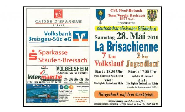 Nach fünf Jahren Pause meldet sich am Samstag, den 28. Mai 2011, „La Brisachienne“, der deutsch- französische Lauf zwischen den Schwesterstädten Neuf- Brisach und Breisach am Rhein mit einigen Neuerungen zurück. Neben einem 7-km Volkslauf wird es in diesem Jahr auch einen 2-km Kinder- und Jugendlauf für die kleinen Sportfreunde und einen Bürgerhock im Zielbereich auf dem Marktplatz geben. Veranstaltet wird der Lauf vom Turnverein Breisach 1877 e.V. und dem Cercle Sports et Loisirs Neuf- Brisach.