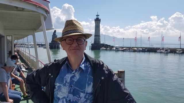 Der romantische Hafen von Lindau mit dem bayrischen Löwen, dem Wachturm und unserem Autor bei seiner Testfahrt mit der weißen Flotte.