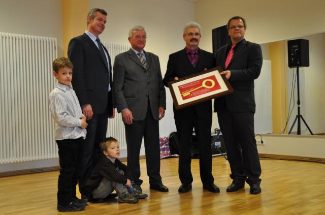 Schlüsselübergabe für neue Räume: Stefan Baum, Martin Bucher, Erhard Bucher, die Reins (v.r.n.l.)
