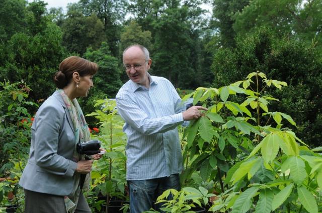 Während der Drehpausen lässt sich Christine Kaufmann die jungen "Baum-Kinder" von Werner Semmler zeigen