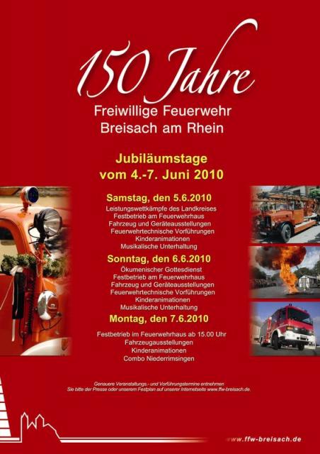 Vom 04. bis zum 07. Juni 2010 finden die Jubiläumsfeierlichkeiten anlässlich des 150. Geburtstages der Freiwilligen Feuerwehr Breisach statt. Feuerwehrkommandant Jochen Böhme und die Mitglieder der Wehr laden alle Breisacherinnen und Breisacher aber natürlich auch Gäste aus nah und fern zu den umfangreichen Festivitäten ein, die am Jubiläumswochenende rund um das Feuerwehrgebäude an der Burkheimer Landstraße sowie an verschiedenen Örtlichkeiten Breisachs ausgerichtet werden.