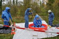 Ein ganzes Dorf, das militärische Übungsdorf „Lanouville“ nahe Hartheim nämlich, war durch einen imaginären Stolleneinbruch unter der Siedlung zum Katastrophengebiet geworden, so das zweite Übungsszenario. Neben dem Ausfall der Strom- und Wasserversorgung galt es Personen mit Drehleiter oder Rettungsseilen und Kletterern aus großer Höhe zu bergen, in Schutzkleidung einen lecken Ammoniakbehälter zu verschließen, Vermisste zu suchen und Brände zu löschen. Da es im Dorf laut Lagevorgabe kein Wasser mehr gab, musste für die Löscharbeiten der zahlreichen Brandherde zunächst eine 1, 2 Kilometerlange Wasserförderstrecke vom Rhein bis ins Dorf aufgebaut werden. In einem mobilen Lazarett wurden die Verletzen eingeliefert und von Sanitätern/Innen und Notärzten/Innen erstversorgt.