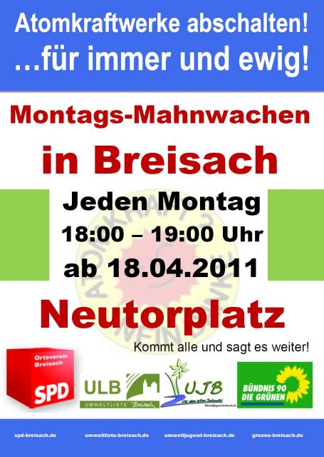 Nach einer kurzen Wachablösung beginnt am Montag, den 18. April 2011, die zweite Runde der Anti- AKW- Mahnwachen auf dem Neutorplatz in Breisach. Unter Federführung des SPD- Ortsvereins treffen sich ab heute jeden Montag von 18 bis 19 Uhr Kernkraftgegner/Innen, um friedlich für den Ausstieg aus der Risikoenergiegewinnung zu demonstrieren