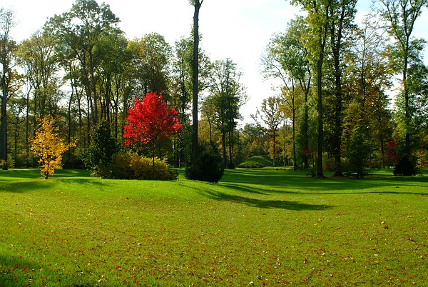 Die Blätter fallen im Queen-Auguste-Victoria-Park: Der noch junge Ahorn wird im Alter sein gewaltiges rotes Feuer zeigen