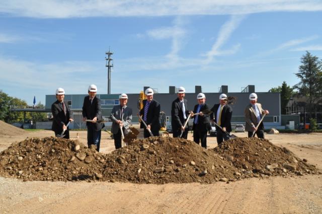 Spatenstechen: Markus Schmidt (Architekt), Volker Lüdke (Moser Bau), Ernst und Michael Hordzewitz, BM Walter Laub, Jürgen Kapp (Merkur- Frucht), Dieter Ehret (Statiker), Hans- Stephan Thomann (Merkur- Frucht) v.l.n.r