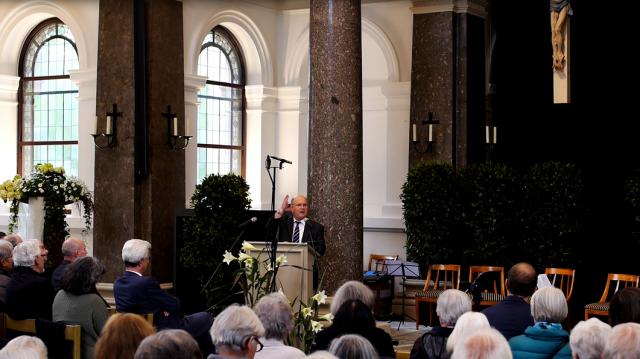 „Mister Goodbye“: Freiburgs "Herr der Gräber und Friedhöfe" Bernhard Keller bei seiner Rede im Friedhofsdom Freiburg