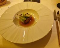 Amuse-bouche: Gebratener Yin Hau Lachs, gebackenes Kalbsbries auf Avocadospirale, Imperial Kaviar, Blutampfer und Buchweizenblinis aus Sauerteig, begleitet von einer feinherben roten Currysauce, die am Tisch aufgegossen wurde.
