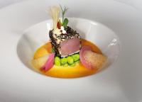 Das dicke Rückenfilet vom Kabeljau wurde mit Mirin angebeizt, angeräuchert und geflammt. Fregula mit geräucherter Paprikaemulsion und Sauerklee ergänzten die feine Säure. Oxalisblätter brachte zusätzliche Frische. Eine mit Butter montierte Safransauce verband die Komponenten. Eine mineralische Auster mit Ingwer-Ananas-Sorbet fügte eine erfrischende, kontrastreiche Note hinzu