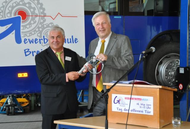 Unter dem Motto TOP-FIT für die Zukunft fand am Samstag, den 14. Mai 2011, an der Gewerbeschule Breisach ein Tag der offenen Tür statt. Neben reichlich Prominenz aus Politik und Wirtschaft waren auch alle an Fahrzeugtechnik interessierten Gäste von nah und fern, weit über die Kreisgrenzen hinaus, herzlich eingeladen, sich über das moderne Bildungsangebot der Gewerbeschule zu informieren. Den Höhepunkt des Tages bildete die Übergabe eines Mercedes Stadt- Busses Typ „Citaro“ durch den Verkaufsleiter für Nutzfahrzeuge der Daimler AG, Gerhard Regending, an den Schulleiter der Gewerbeschule, Norbert Meigel.
