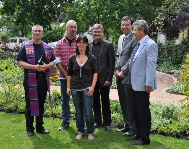 Freude über neues Gräberfeld: Pfarrer, Gärtner und Bürgermeister im Schulterschluss (Bild: J. W. Steckmeister)