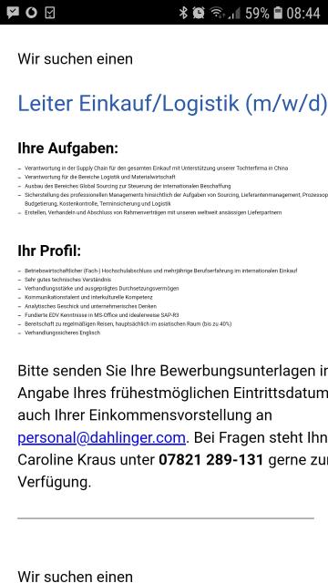 Screenshot über Ausschreibung der Stelle bei Ch. Dahlinger