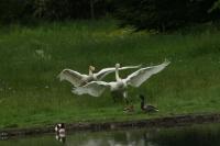 Die Umkircher Singschwäne steigen für ihre Flugrunden immer wieder in den Umkircher Himmel auf, doch sie blieben dem Queen-Auguste-Victoria-Park treu. Schwäne zählen zu den Welt-Meistern der Monogamie; ein Schwanen-Paar bleibt sich lebennslang treu. Dieses Jahr hat sich das Singschwäne-Paar für die Geburt ihrer Jungen Christi Himmelfahrt ausgesucht. An diesem 40. Tag des Osterfestkreises feiern die Christen die Rückkehr Jesu Christi als Sohn Gottes zu seinem Vater in den Himmel. Nach 35 Brut-Tagen erblickten am 17.5.2012 vier junge Singschwäne in Umkirch das Licht der Welt. Wie der Name schon sagt, kann der Singschwan ausdrucksvoll singen. Aus dieser Eigenschaft leitet sich seit der Antike die metaphorische Gleichsetzung des Schwans mit dem Dichter her. Singschwäne sind auch auf der finnischen 1-Euro-Münze abgebildet. Die Singschwäne (Wissenschaftlicher Name Cygnus cygnus) gehören zur Familie der Entenvögel in der Gattung der Schwäne. Es sind Brutvögel der osteuropäischen und sibirischen Taiga. In Umkirchs Queen-Auguste-Victoria-Park wurden vor rund 15 Jahren zwei Pärchen Singschwäne ausgesetzt. Sie brachten inzwischen zahlreiche Jungen zur Welt. Jedes Jahr werden die Jungschwäne (wenige Tage nach ihrer Geburt) schon Opfer von Raubvögeln. Im letzten Jahr hat nur ein Jungschwan überlebt. Dennoch ist das Ensemble des Umkircher "Singschwan-Orchesters" in den letzten Jahren auf insgesamt 12 Mitglieder (Singschwäne) angestiegen. Nachdem Park-Fotograf Achim Keller die Schwäne aufgenommen hatte beobachtete auch Singschäne-Fotograf Werner Trageiser Umkirchs Entenvögel; es gelangen ihnen erstaunliche Schnappschüsse.