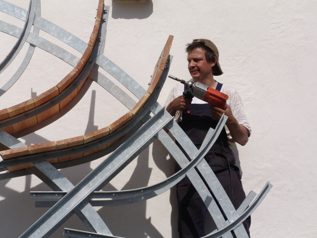 Bernhard Weis von der Schlosserei Weis aus Simonswald ist zur Zeit damit beschäftigt, die hölzernen Schaufeln an das Metallgerüst des neuen Mühlrades an der Umkircher Mühle zu montieren. "Es wird vermutlich Freitag fertig sein", sagt er. 36 Schaufeln kommen an das neue Wasserrad. Allerdings müssen auch noch Betonarbeiten unter dem Auflager und beim Zufluss vorgenommen werden.