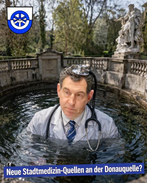 Die Stadt Villingen-Schwenningen hat bereits das neue medizinische Versorgungszentrum „Regiomedes eG“ unter der Rechtsform einer gemeinnützigen Genossenschaft organisiert. Es wird sich also in der Zukunft zeigen, ob Markus Milbradt am Puls der Notwendigkeiten unserer Zeit im Fokus Medizin-Wende lag. Unser satirisches Foto zeigt in Anlehnung an unseren Titel und das brisante Thema OB Pauly mit Stethoskop im Ärztekittel schwimmend in der Donauquelle.