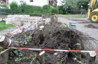 Auf der Großbaustelle Gutshofplatz Umkirch geht es voran. Am Montag, den 30. August 2010, sind auch die letzten Reste des Buchenheckenumwachsenen Laubengangs von ihrem ursprünglichen Stand- beziehungsweise Wuchsort am Nordende des Gutshofplatzes entfernt worden. Während das Metallgerüst an anderer Stelle neue Verwendung finden wird und einstweilen auf der Rasenfläche neben dem Gutshof zwischenlagert, wurde die alte Buchenhecke samt Wurzelwerk restlos beseitigt.