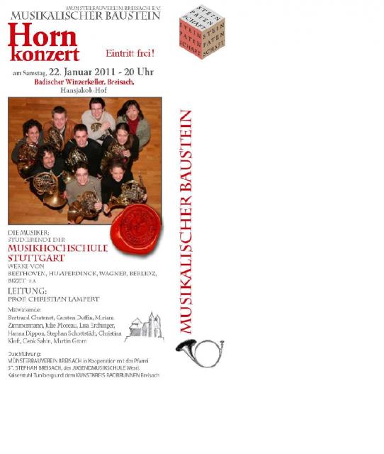 Einen musikalischen Baustein für den Münsterbauverein Breisach gibt es am Samstag, 22.Januar 2011, um 20.00 Uhr im Hansjakob-Hof des Badischen Winzerkellers in Breisach. Die Hornklasse der Musikhochschule Stuttgart unter der Leitung von Professor Christian Lampert spielt zu Gunsten des Breisacher Wahrzeichens. Organisatoren der hochkarätigen Veranstaltung sind der Münsterbauverein Breisach, die Pfarrei St. Stephan Breisach, der Kunstkreis Radbrunnen sowie die Jugendmusikschule Westlicher Kaiserstuhl- Tuniberg.