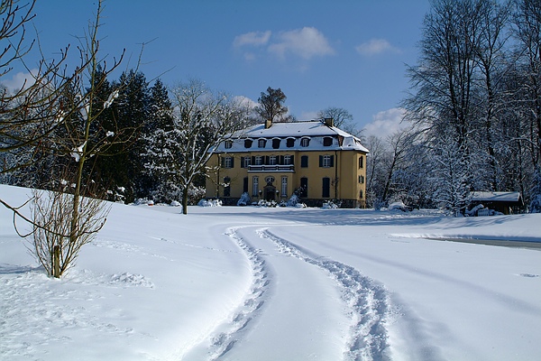 Zwei Spuren im Schnee führen durch den Queen-Auguste-Victoria-Park zum Schloss