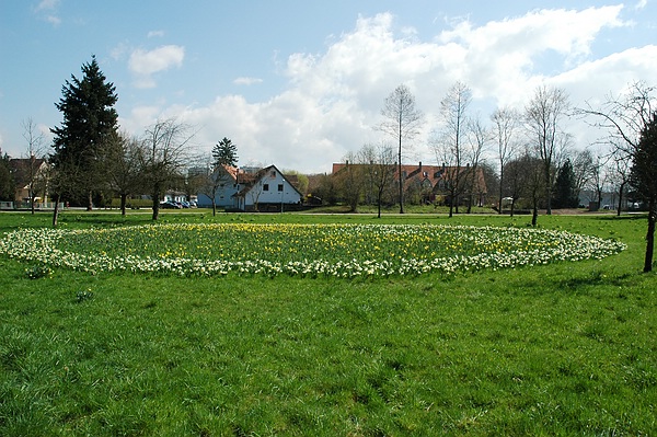 Osterglocken im Park vor der Schlossmühle: vom Queen-Auguste-Victoria-Park gestiftet