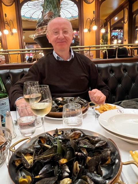 Werner Semmler beim Muschel-Test im Restaurant Bofinger in Paris