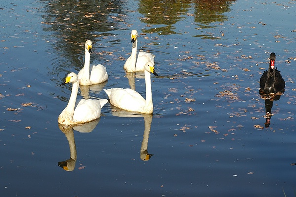 Vier plus eins: Singschwäne und Schwarzschwan im Fulwellpark