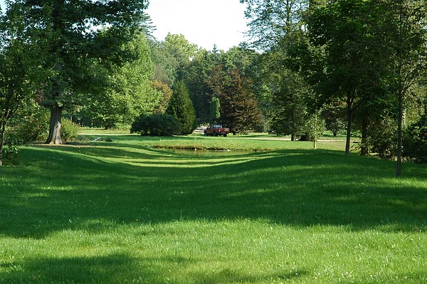 Ein kleines Tal mit einer Nass-Wiese im Queen-Auguste-Victoria-Park führt das Auge zu einer Baumkulisse