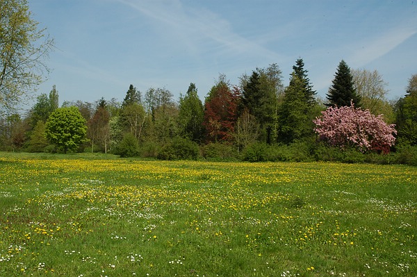 Der Frühling ist das: Baumkulisse mit Schlosswiese im Queen-Auguste-Victoria-Park