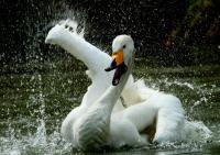 Die Umkircher Singschwäne steigen für ihre Flugrunden immer wieder in den Umkircher Himmel auf, doch sie blieben dem Queen-Auguste-Victoria-Park treu. Schwäne zählen zu den Welt-Meistern der Monogamie; ein Schwanen-Paar bleibt sich lebennslang treu. Dieses Jahr hat sich das Singschwäne-Paar für die Geburt ihrer Jungen Christi Himmelfahrt ausgesucht. An diesem 40. Tag des Osterfestkreises feiern die Christen die Rückkehr Jesu Christi als Sohn Gottes zu seinem Vater in den Himmel. Nach 35 Brut-Tagen erblickten am 17.5.2012 vier junge Singschwäne in Umkirch das Licht der Welt. Wie der Name schon sagt, kann der Singschwan ausdrucksvoll singen. Aus dieser Eigenschaft leitet sich seit der Antike die metaphorische Gleichsetzung des Schwans mit dem Dichter her. Singschwäne sind auch auf der finnischen 1-Euro-Münze abgebildet. Die Singschwäne (Wissenschaftlicher Name Cygnus cygnus) gehören zur Familie der Entenvögel in der Gattung der Schwäne. Es sind Brutvögel der osteuropäischen und sibirischen Taiga. In Umkirchs Queen-Auguste-Victoria-Park wurden vor rund 15 Jahren zwei Pärchen Singschwäne ausgesetzt. Sie brachten inzwischen zahlreiche Jungen zur Welt. Jedes Jahr werden die Jungschwäne (wenige Tage nach ihrer Geburt) schon Opfer von Raubvögeln. Im letzten Jahr hat nur ein Jungschwan überlebt. Dennoch ist das Ensemble des Umkircher "Singschwan-Orchesters" in den letzten Jahren auf insgesamt 12 Mitglieder (Singschwäne) angestiegen. Nachdem Park-Fotograf Achim Keller die Schwäne aufgenommen hatte beobachtete auch Singschäne-Fotograf Werner Trageiser Umkirchs Entenvögel; es gelangen ihnen erstaunliche Schnappschüsse.