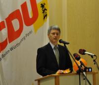 Als „Haushalt der knappen Kassen“ bezeichnete Landrätin Dorothea Störr-Ritter das Jahr 2011. Mit „Überlegungen, die in Richtung Zukunft gehen“ und dem Ziel „Ministerpräsident Stefan Mappus“ sei die Landes- CDU jedoch auf dem richtigen Kurs. „Keiner konnte wissen, was da auf uns zu kommt“, so der nächste Redner, Staufens Bürgermeister Christian Benitz, über das zentrale Staufener Thema der letzten Jahre: Die Erdhebungen durch Geothermiebohrungen im Jahre 2007. 268 Gebäude und rund 50 Millionen Euro Schaden, so die traurige Zwischenbilanz des „Riesenproblems“. Allerdings, so Benitz auf einen Artikel in der Badischen Zeitung Bezug nehmend, sei die Erde unter Staufen noch nicht „in Ruhe“. Zwar habe sich das Tempo der Erdanhebungen verringert, allerdings nur um 20%. Insgesamt hat sich der Boden unter der Staufener Altstadt mittlerweile um über 30 Zentimeter angehoben, berichtete Benitz und bedankte sich beim Land für die bisher geflossenen Fördergelder. Allerdings gestand der die Überforderung angesichts der „Naturkatastrophe“ unverhohlen ein, zumal „die Schuldfrage schwer zu klären ist“. Allerdings hofft Staufens Bürgermeister, dass die Hebungen in etwa zwei Jahren beendet sein werden. Erst dann mache es Sinn, mit den Sanierungen zu beginnen. Mit den Themen Kinderkrippe und Werkrealschule zeige Staufen jedoch, dass es auch „anderes könne als Rissbewältigung“. Es geht nicht nur um Häuser sondern auch um Menschen“, betonte der Gründer der Stiftung „Wir halten Staufen zusammen“, Wolfgang Schuhmann. Er forderte alle Anwesenden auf, „die Risse zu stoppen“ und mit dem Kauf einer Sonderbriefmarke oder eines Stiftungskruges ihren Solidarbeitrag zu leisten.Anschließend verlas Tagungspräsident Armin Schuster die Kandidaten für die drei zu wählenden Gremien. Währen die Mitglieder dreierlei Stimmzettel ausfüllten, lieferte der Kreisvorsitzende Dr. Patrick Rapp seinen Rechenschaftsbericht ab. Wie sein Vorredner Gundolf Fleischer nannte auch Rapp den Schutz der regionalen Landwirtschaft sowie den Ausbau der Rheintalbahn als Schwerpunkte der politischen Aktivitäten in den vergangenen Monaten. Während andere Parteien über Nachwuchsmangel klagen, freute sich Rapp, verzeichnete die CDU Mitgliederzuwachs, ein klares Zeichen für die „Verankerung der Partei in der Bevölkerung“.