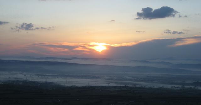 Über 143 Stahlstufen erklimmen die Wanderer/Innen den 42, 50 Meter hohen Turm, der erst vor fünf Jahren erbaut worden ist. Hier oben weht noch ein kühler Wind, aber dafür sind die letzten Wolken am Himmel fast verschwunden. Und der Aufstieg hat sich schon jetzt gelohnt. Der Blick über die Rheinebene hin zum Schwarzwald gleicht mit den vom Nebel verhangenen Tälern einer Märchenlandschaft. Genau um 6 Uhr 10 schiebt sich der feurige Sonnenball hinter Bergen und Wolkenwand hervor. Und sogleich wärmen die Lichtstrahlen die fröstelnden Naturfreunde/Innen.