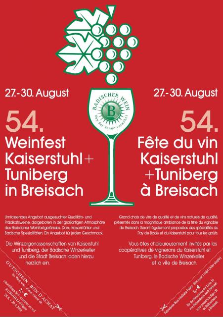 Am Freitag, den 27. August 2010, beginnt auf dem Weinfestgelände in Breisach das 54. Bezirksweinfest Kaiserstuhl/ Tuniberg. Auf dem viertägigen Großereignis können rund 300 verschiedene Weine und Sekte der Winzergenossenschaften aus den Anbaugebieten Kaiserstuhl und Tuniberg verkostet werden. Traditionell beginnt das Fest am Freitagabend mit einem Umzug vom Marktplatz auf das Festgelände sowie der Krönung der neuen Weinprinzessin durch die Badische Weinkönigin. Etwa 100.000 Besucher werden zum Weinfest erwartet.