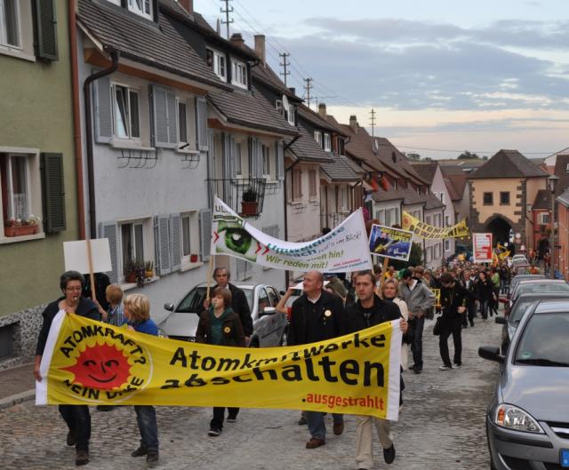 Über 600 Menschen haben in Breisach am Montagabend, den 04. Oktober 2010, gegen die geplante Laufzeitverlängerung der deutschen Atomkraftwerke demonstriert. Auf einem einstündigen Rundkurs durch die Innenstadt zeigten die Demonstrationsteilnehmer/Innen mit Trommeln, Trillerpfeifen und Transparenten, was sie von den Plänen der schwarz- gelben Regierung hielten, den geplanten Atomausstieg für unbestimmte Zeit auf Eis zu legen: Nichts! Mit dem Verlauf der Demonstration waren Organisatoren/Innen und Polizei gleichermaßen zufrieden.
