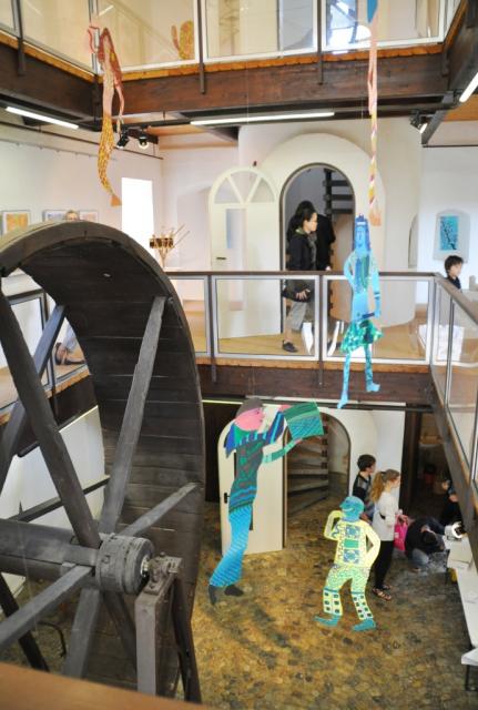 Unter Anleitung ihrer Kunstlehrer/In Anna Stiefvater, Nicolas Manz und Manuel Frattini hatten die Schüler/Innen des MSG sich in verschiedenen Techniken der Bildenden Kunst ausprobiert. Von Gipsbauwerken, die in Milchtütennegativen gegossen worden waren, über Kinderbuchillustrationen im Stile des Surrealismus bis hin zu einem Zoo aus hölzernen „Murmeltieren“ reicht die Palette der Werke, die im Radbrunnen zu sehen sind. Ein besonderes Lob gab es vom Vorsitzenden des Kunstvereins für das Riesenmobile aus Pappfiguren, das die drei Etagen des Radbrunnens durchzieht. Kaum einem professionellen Künstler sei es bisher gelungen, die komplizierte Architektur des Turmes so zu besetzen, unterstrich Göggel.
