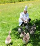 Küchenchef Martin Weißer als Ober-Gänserich unter seinen Graugänsen. (Bild: Rindenmühle)