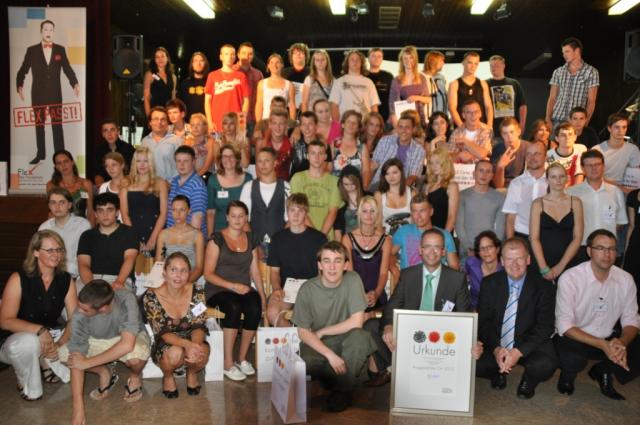 „Wir sind sehr stolz, ein „Ausgewählter Ort“ im Land der Ideen zu sein“, so Thomas Heckner, Gründer und Leiter der FLEX- Fernschule. „Der Glanz unserer Auszeichnung soll abfärben auf unsere Schülerinnen und Schüler. Für alle gilt, dass sie in ihrem bisherigen Leben mit besonderen Nachteilen zu kämpfen hatten, und sie dürfen wirklich stolz sein, mit sehr viel Eigeninitiative den Anschluss geschafft zu haben“, betonte Heckner. „Durchhaltevermögen und Leistungsbereitschaft“, nannte Prälat Dr. Peter Neher als zentrale Eigenschaften der Fernschüler/Innen. Mit Hilfe von FLEX sei es den einstigen Schulverweigerern gelungen ihr eigener „Coach und Lernpartner“ zu werden. „Die Fernschule“, so der Prälat weiter,“ grenze niemanden aus sondern setze bei den Stärken jedes Einzelnen an, denn in jedem jungen Menschen stecken, jenseits von Problemen oder sozialer Herkunft, Talente, Sehnsüchte und tolle Ideen.“ Weihbischof Dr. Bernd Uhl, der von einem FLEX- Schüler mit `Guck mal, da kommt ja auch ein Pastor´ begrüßt worden war, trug es mit Humor und wünschte allen Absolventen/Innen Gottes Segen und gutes Gelingen ihres weiteren Lebens. „Lernen in der Schule liegt nicht jedem“, erklärte Dr. Thomas Geißler die rund 8% der Schulverweigerer. „FLEX hingegen knüpfe an der Realität der Jugendlichen an, stärke den Glauben an sich selbst und fördere die Bereitschaft, sich wieder Ziele zu setzen.“ Der Abgesandte aus Berlin gratulierte allen Absolventen/innen im Namen der Bundesbildungsministerin. „Unter über 2.200 Bewerbern den Preis zu ergattern“, so Michael Hahl von der Deutschen Bank, „sei eine echte Sensation.“ Stellvertretend für „seine“ Schule wurde Thomas Heckner die Urkunde „Ausgewählter Ort 2010“ samt Trophäe überreicht. Im Anschluss eine „musikalische Zwischenmahlzeit“ mit dem Duo PaPaul und dem Rapper „Twoface“ alias FLEX- Schüler Alexander Neumann wurden den erfolgreichen Fernschüler/Innen ihre Abschlusszeugnisse überreicht. Acht der Absolventen/Innen konnten sich zudem über Auszeichnungen für besondere Leistungen freuen. Nach einem Gruppenfoto mit Urkunde und Schulleitung gab es einen Ausklang bei Imbiss und Getränken.