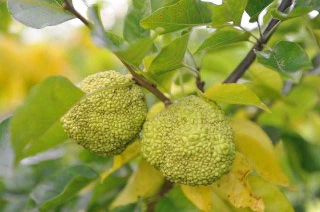Der Indianer-Baum Osagedorn trägt reife Früchte im Queen-Auguste-Victoria-Park